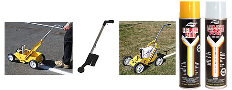 Carrito 800 Vers-A-Striper para Pavimento, se usa en conjunto con  la línea de pinturas 700 Striping Paint de base solvente de extra larga duración en interiores y exteriores en colores 720-Amarillo Tráfico, 730-Rojo Tráfico,  710-Blanco Tráfico. Para pintar Rayas de Seguridad y Líneas de estacionamiento en plantas industriales.